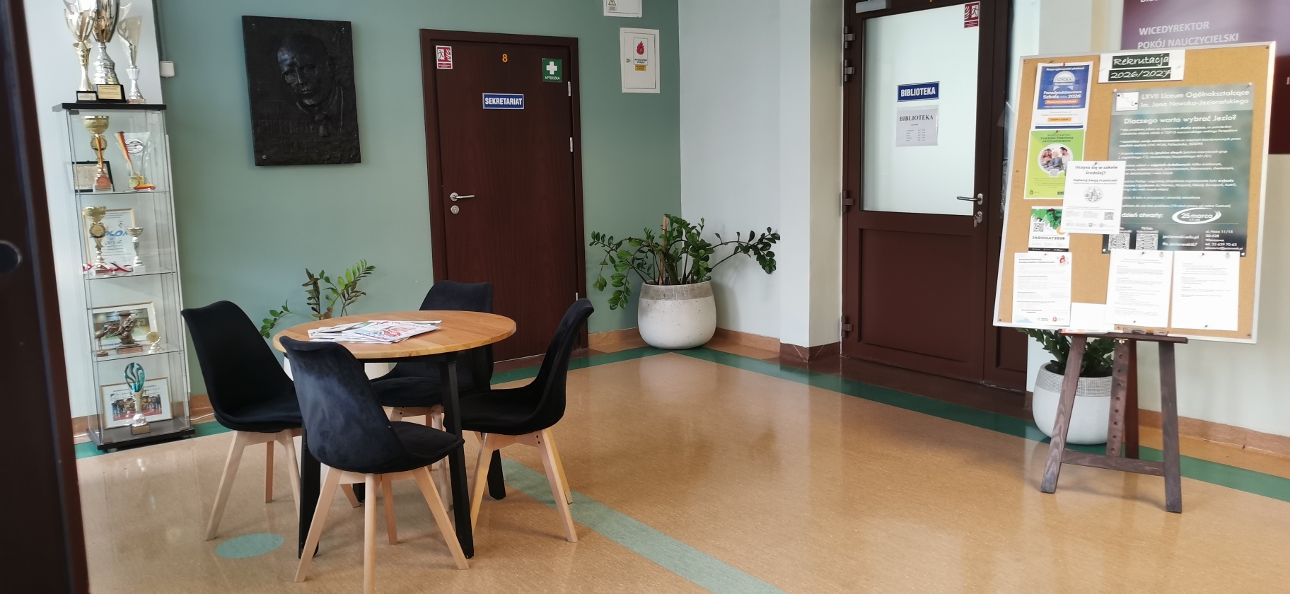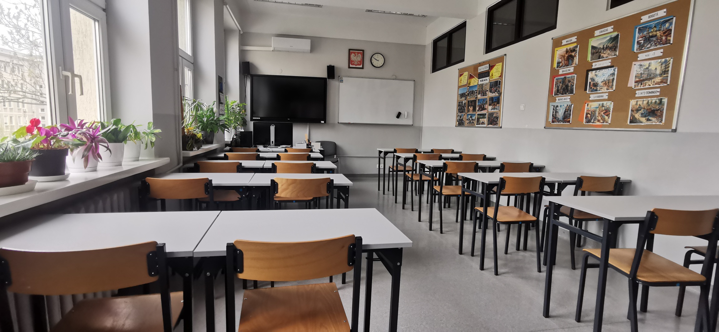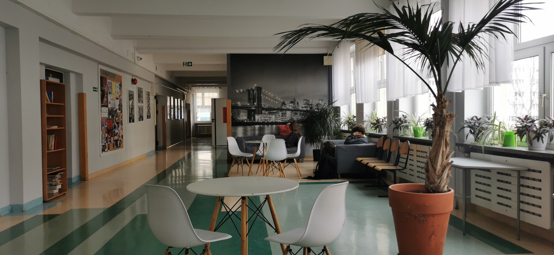 Nasza szkoła wyróżnia się nowoczesnymi i funkcjonalnymi wnętrzami. Sale lekcyjne są odnowione oraz wyposażone w nowoczesny sprzęt. Sale lekcyjne są klimatyzowane. Przestrzenie wspólne są przestronne, zapewniają wygodne miejsce do wypoczynku.