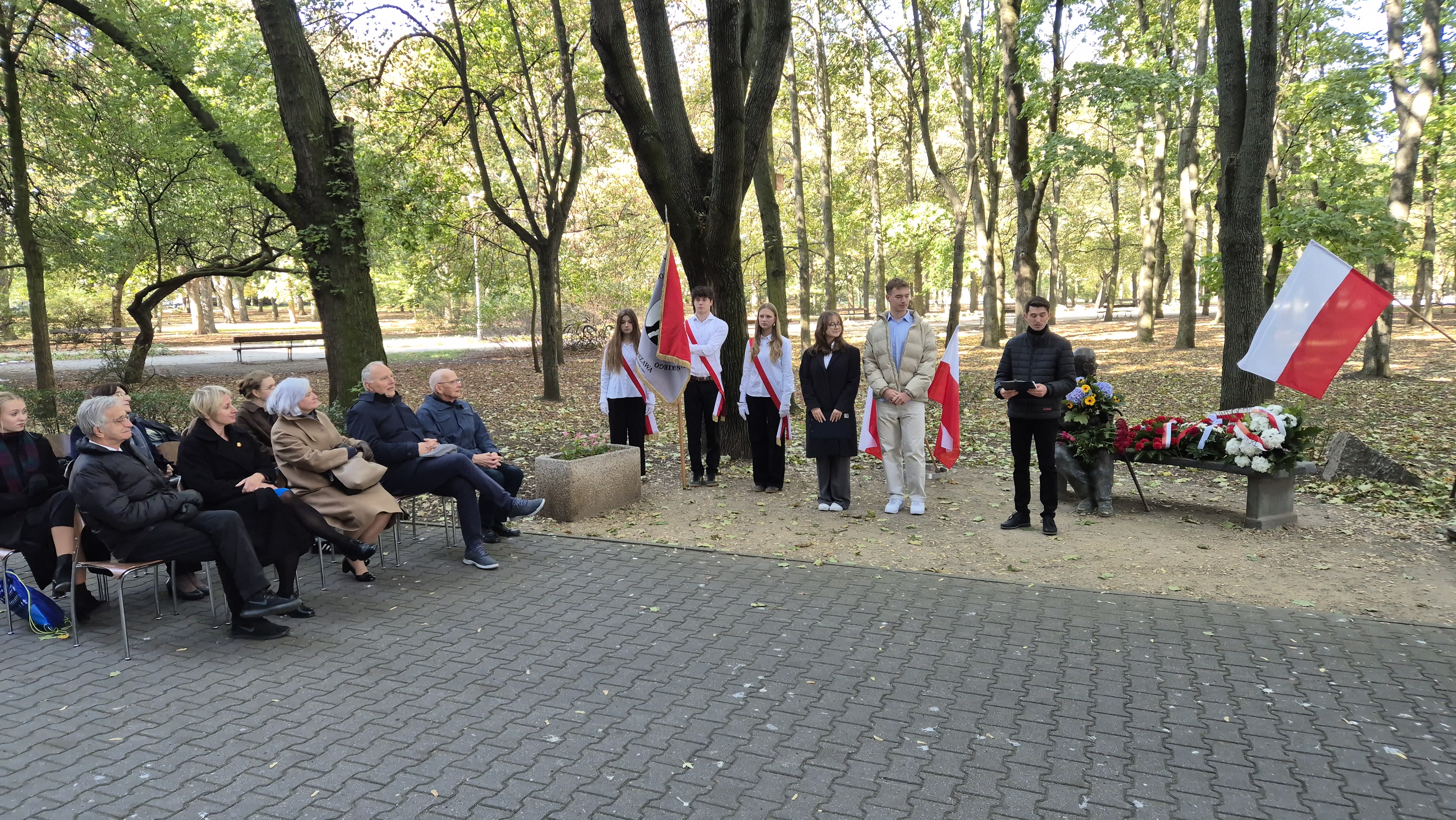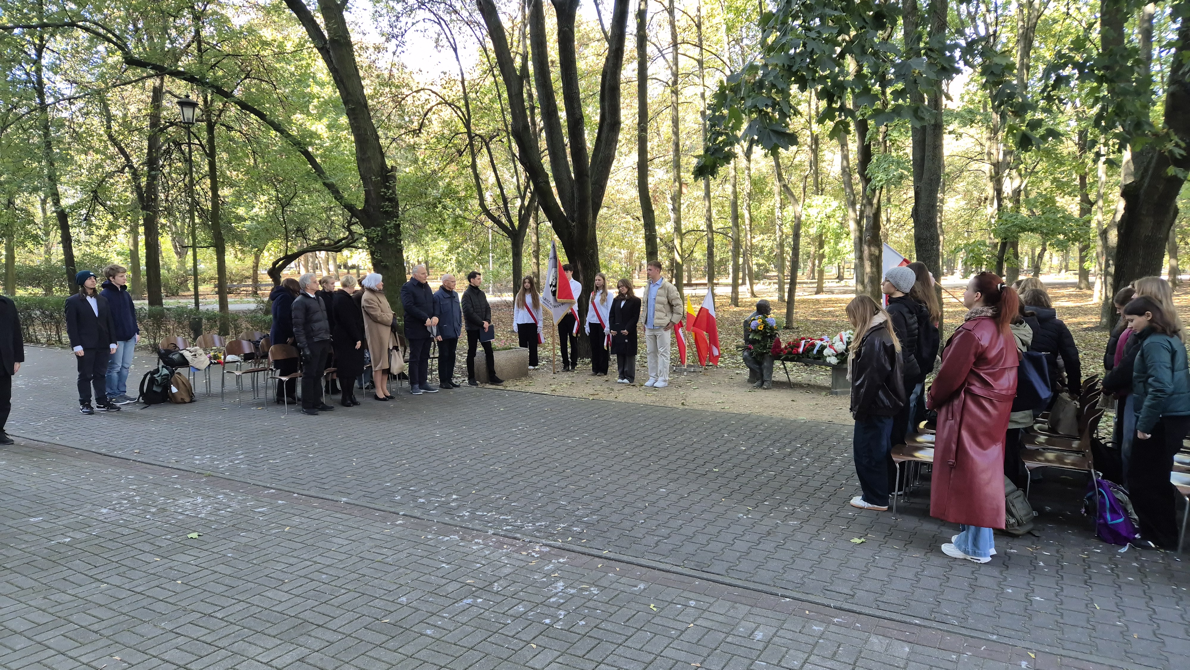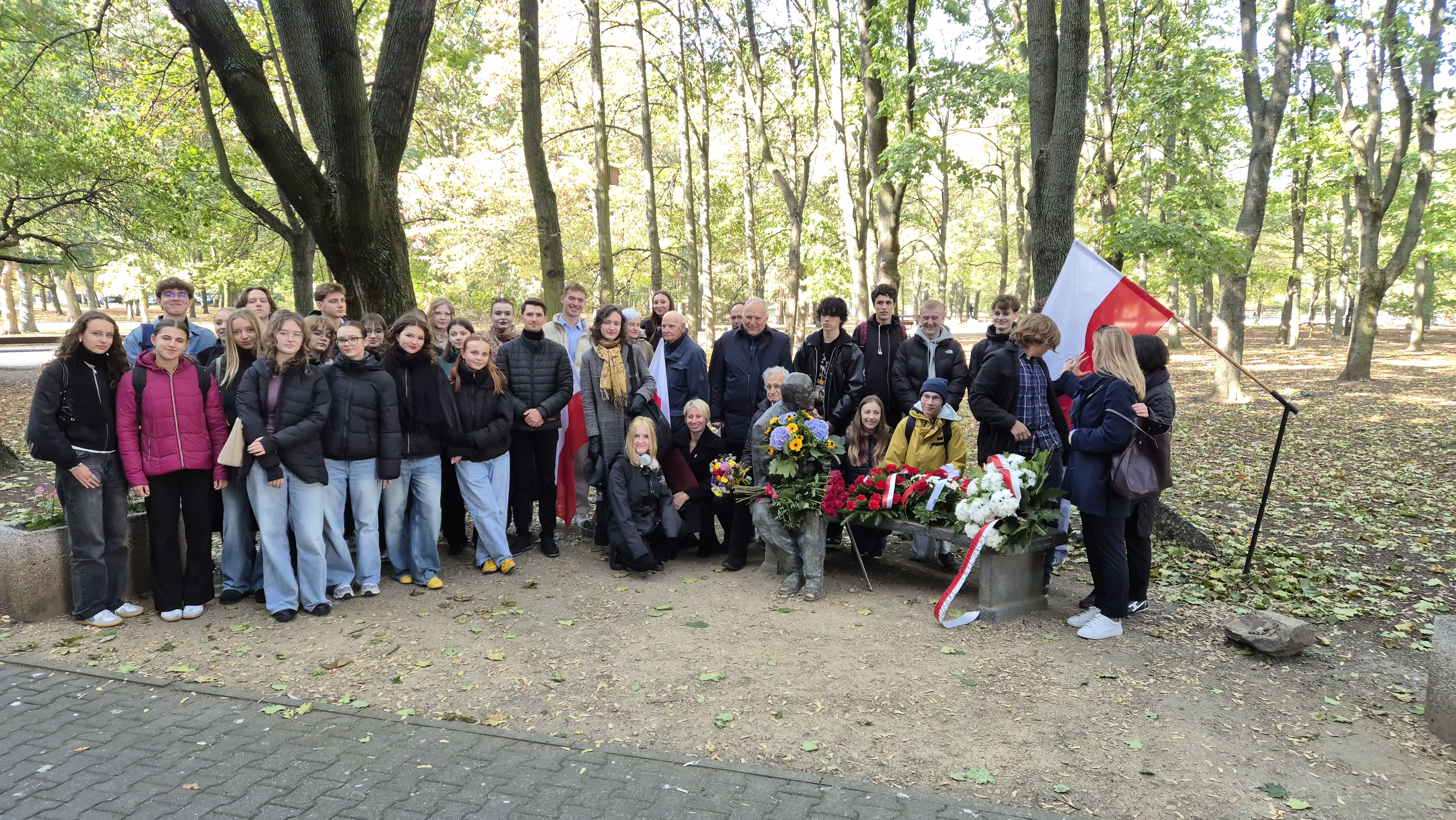 2 października 2025 roku nasza szkoła wzięła udział w wyjątkowej uroczystości obchodów z okazji 111. urodzin Jana Nowaka-Jeziorańskiego. Wydarzenie miało miejsce przy pomniku-ławeczce naszego patrona. Był to także czas spotkań z niezwykłymi gośćmi: panem Jackiem Taylorem, prawnikiem i politykiem, działaczem opozycji antykomunistycznej w okresie PRL, prywatnie bliskim przyjacielem Nowaka-Jeziorańskiego; panem Jarosławem Kurskim, dziennikarzem i publicystą, autorem biografii naszego patrona. Wśród zaproszonych gości byli z nami także państwo Hanna i Jacek Fedorowiczowie, bliscy przyjaciele Nowaka-Jeziorańskiego; pani Anna Stępień, dyrektor Biblioteki Publicznej w Dzielnicy Śródmieście; pani Izabela Piaskowska, dyrektor STO nr 1; pani Agnieszka Pawelec, przedstawiciel gabinetu urzędu Rady Miasta.